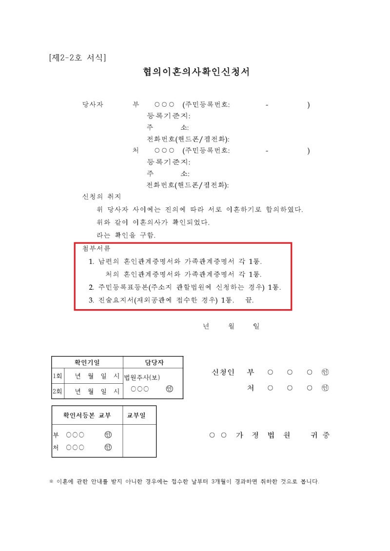 협의이혼의사확인신청서를 작성하고, 부부가 함께 가정법원에 출석하여 신청서를 제출 하셔야 합니다.